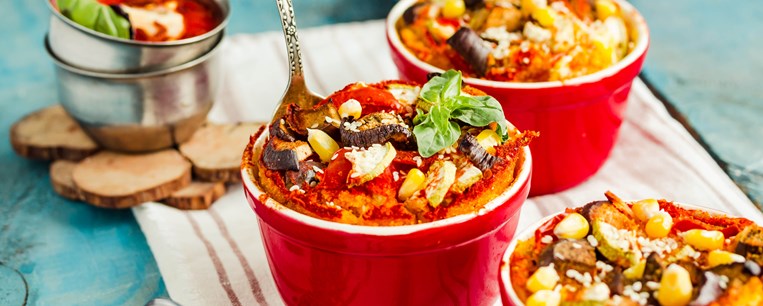 Σε ένα πυρέξ στρώνουμε πρώτα τις πατάτες και μετά τις μελιτζάνες.
